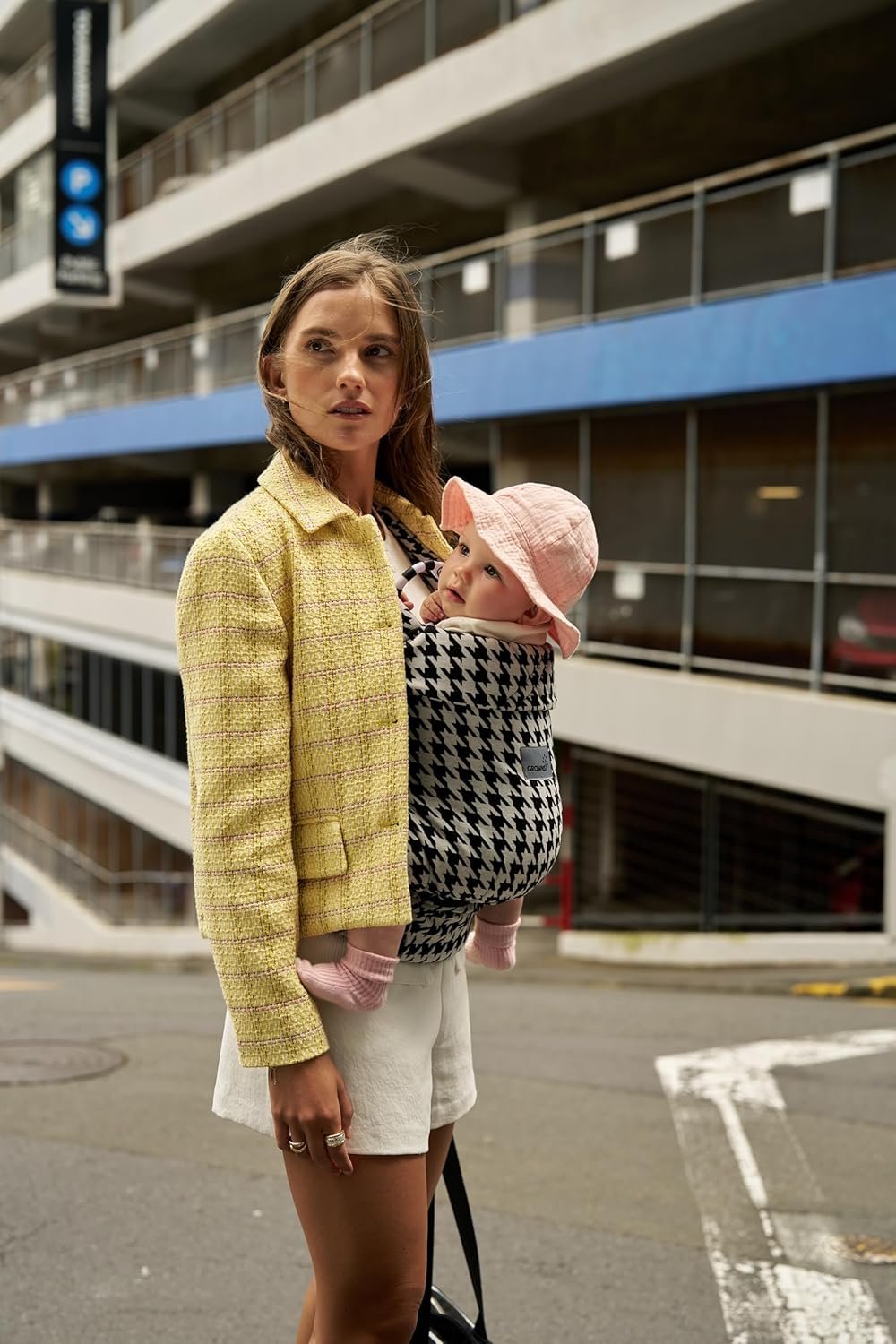The houndstooth fabric gives it a clean, modern look that feels more like everyday wear than specialized baby gear. The material feels textured yet soft, designed to stay comfortable against both baby’s skin and the parent’s clothing.