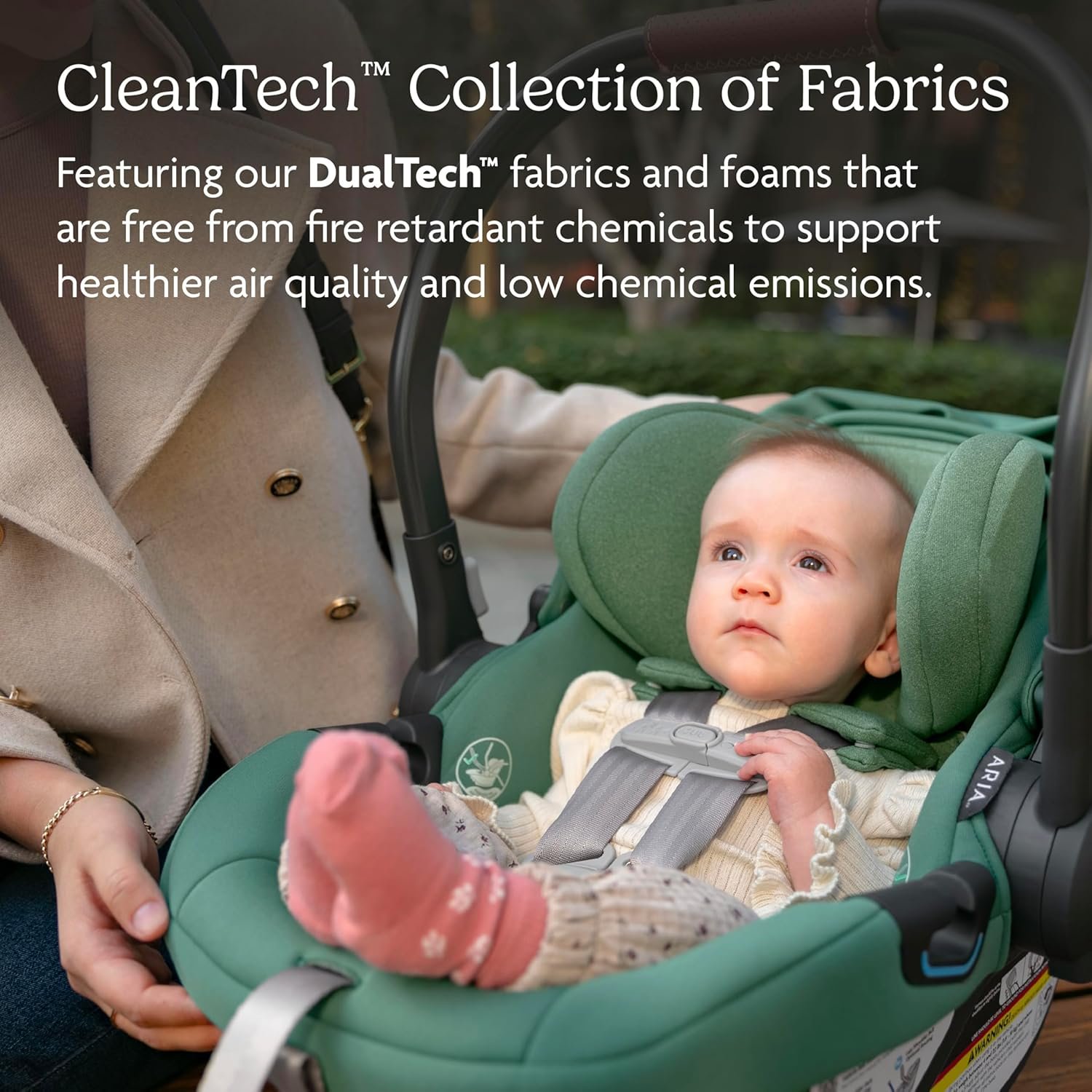 Inside the seat, DualTech™ fabric blends two types of performance textiles. One side offers plush softness against your newborn’s skin, while the other delivers moisture control and breathability for longer rides. What parents especially value is that these fabrics are naturally fire-retardant-free, aligning with the growing demand for safer, non-toxic materials in baby gear.